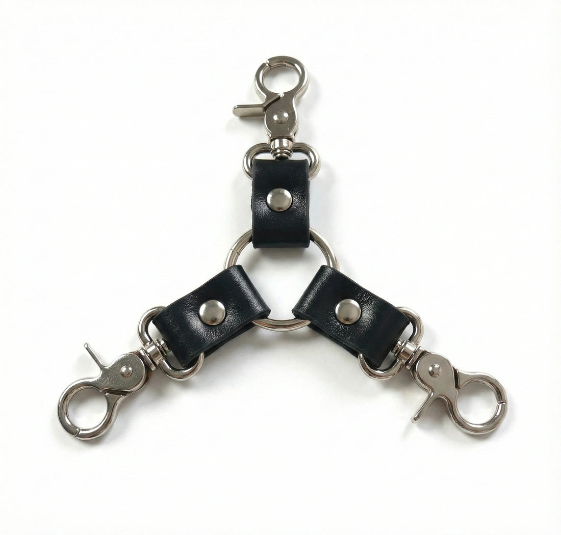 The essential BDSM connector for serious bondage enthusiasts. This professional-grade 3-way bondage connector features swivel clips and genuine leather construction, designed to securely connect cuffs, harnesses, and restraints in multiple configurations.